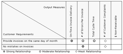 We can use a decision matrix to explore the relationship between customer requirements and output measures in order to identify the key output measures to track. As shown in the following example, customer requirements are mapped against potential output measures. The strength of the relationship between the two is rated by the stakeholders of the process.