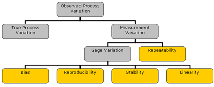 The process variance observed comprises of the true process variance and the measurement variance. The source of measurement variation (error) can be characterised in five ways as shown in the figure below.