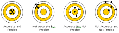 Measurement errors may be one of the 4 scenarios given below. Generally, low accuracy could be due to stability, linearity or bias issues. Low precision could be due to reproducibility (if there is more than one operator) or repeatability (if one than one trial per operator).