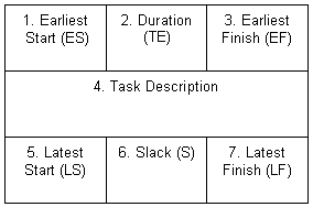 The PERT diagram comprises of a network of nodes connected by arrows. Each node may contain up to 7 items of information.